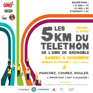 L’Office Municipal des Sports (OMS) de Grenoble, accompagné de Grenoble Trail, de l’école de communication Ecoris, des Jeunes Sapeur-Pompier de Saint-Égrève et de ses associations sportives, se mobilise en organisant la 9e édition des 5km du Téléthon !
