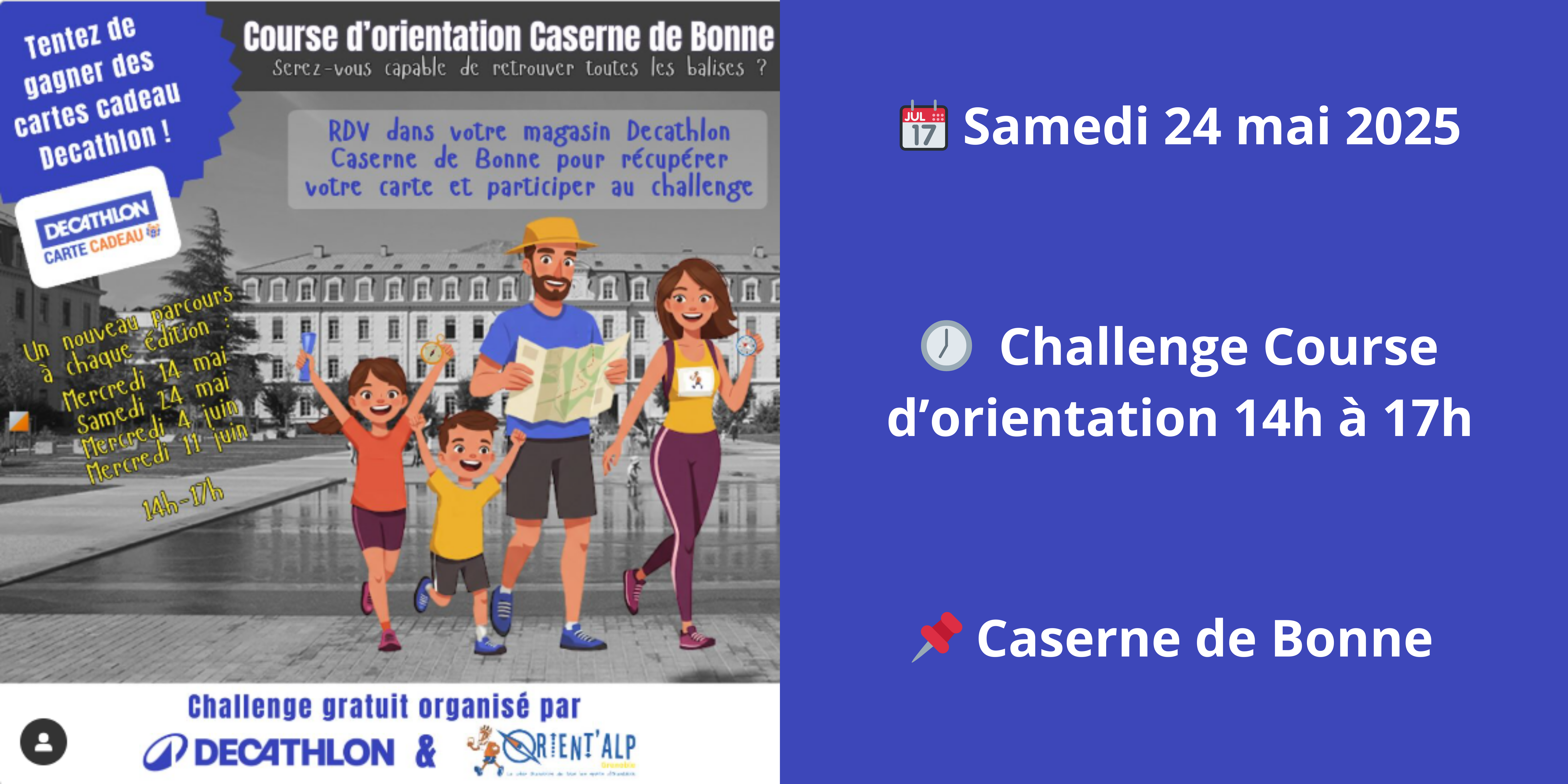 Orient’Alp et Decathlon organisent une animation de course d’orientation à la Caserne de Bonne le samedi 24 mai à partir de 14h et jusqu’à 17h