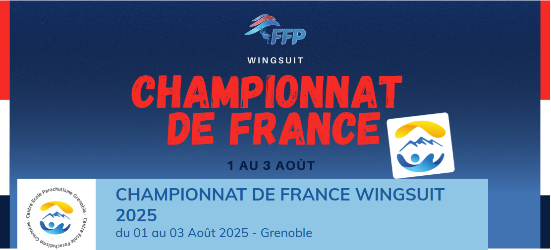 Le Centre Ecole de Parachutisme de Grenoble (38) organise, sous l’égide de la Fédération Française de Parachutisme, le Championnat de France de Wingsuit. Cette compétition réunira tous les passionnés de la discipline désireux de se confronter aux défis des deux épreuves. Elle fera également office de répétition générale en vue de la Coupe du Monde et des Championnats d’Europe de la discipline, prévus du 15 au 21 août à Prostejov, en République Tchèque.