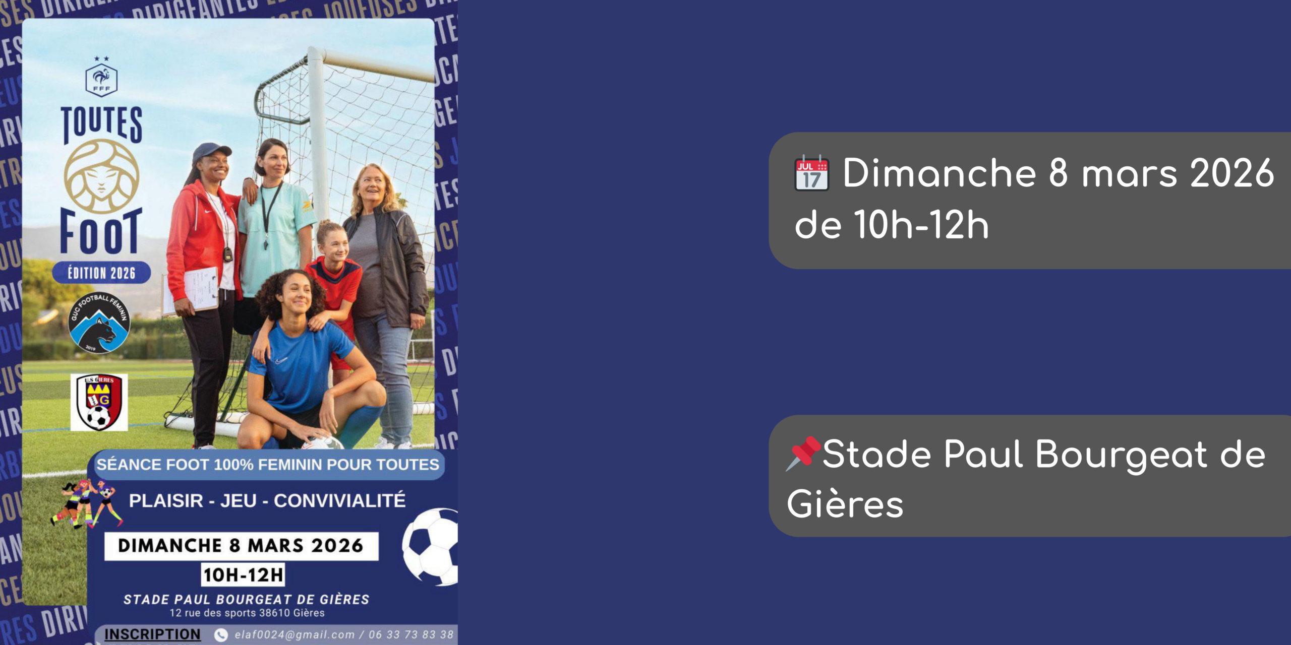 À l’occasion de Toutes Foot, le GUC Football Féminin et l’US Gières vous invitent à une séance de football 100 % féminine, ouverte à toutes !