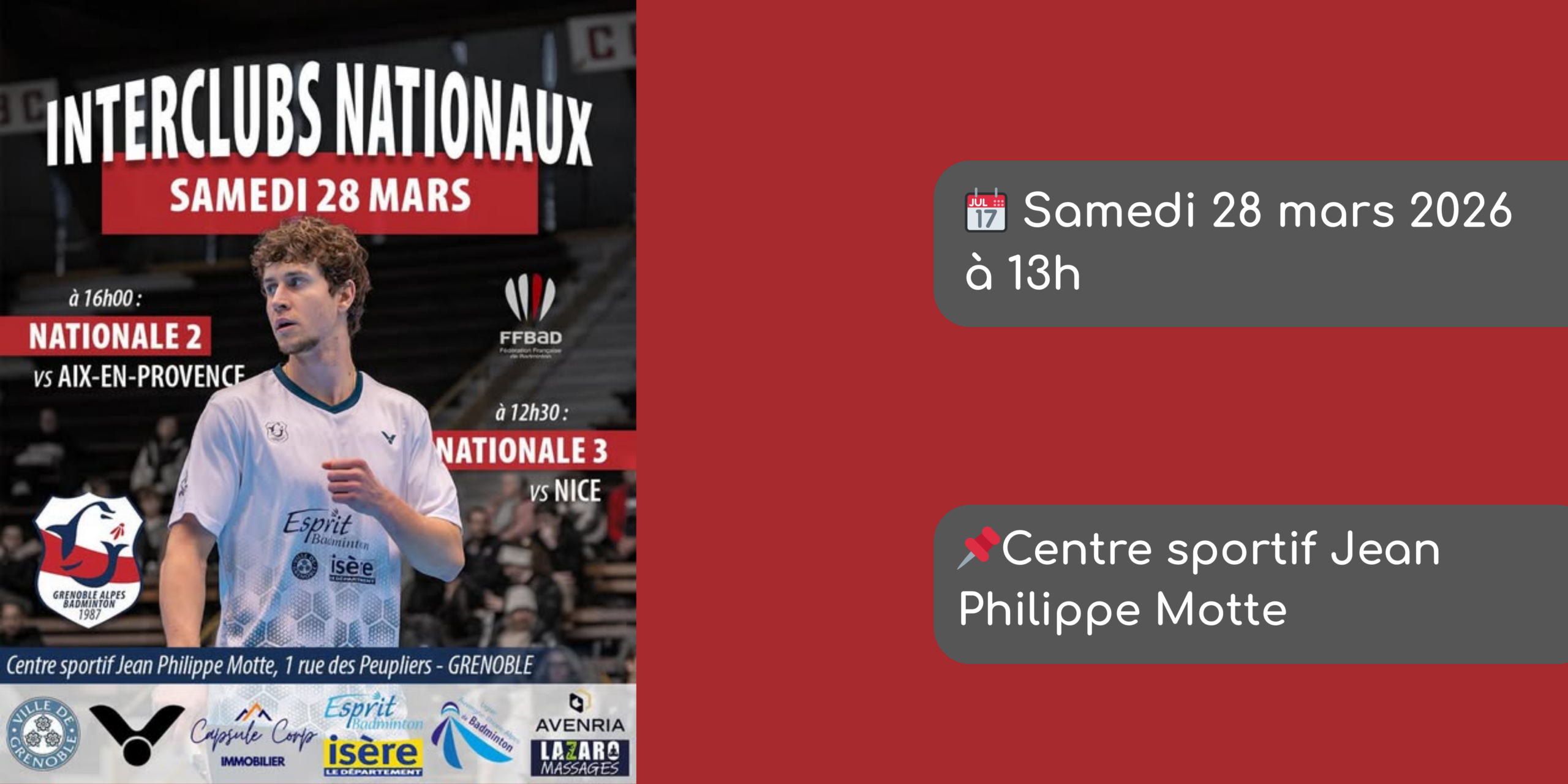 Ce samedi 28 mars, les équipes de N2 et N3 du Grenoble Alpes Badminton disputeront leur dernière rencontre à domicile de la saison au Centre sportif Jean Philippe Motte