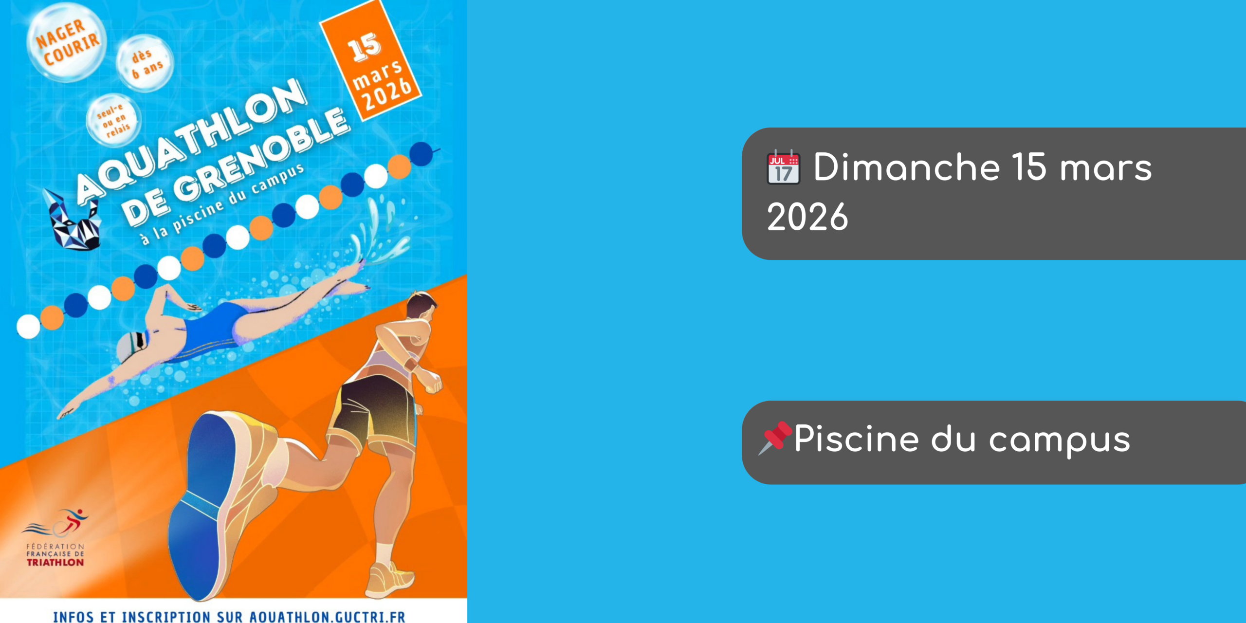 L’aquathlon du Guc Triathlon aura lieu le dimanche 15 mars 2026 à la piscine universitaire 🏊🏃♀️➡️