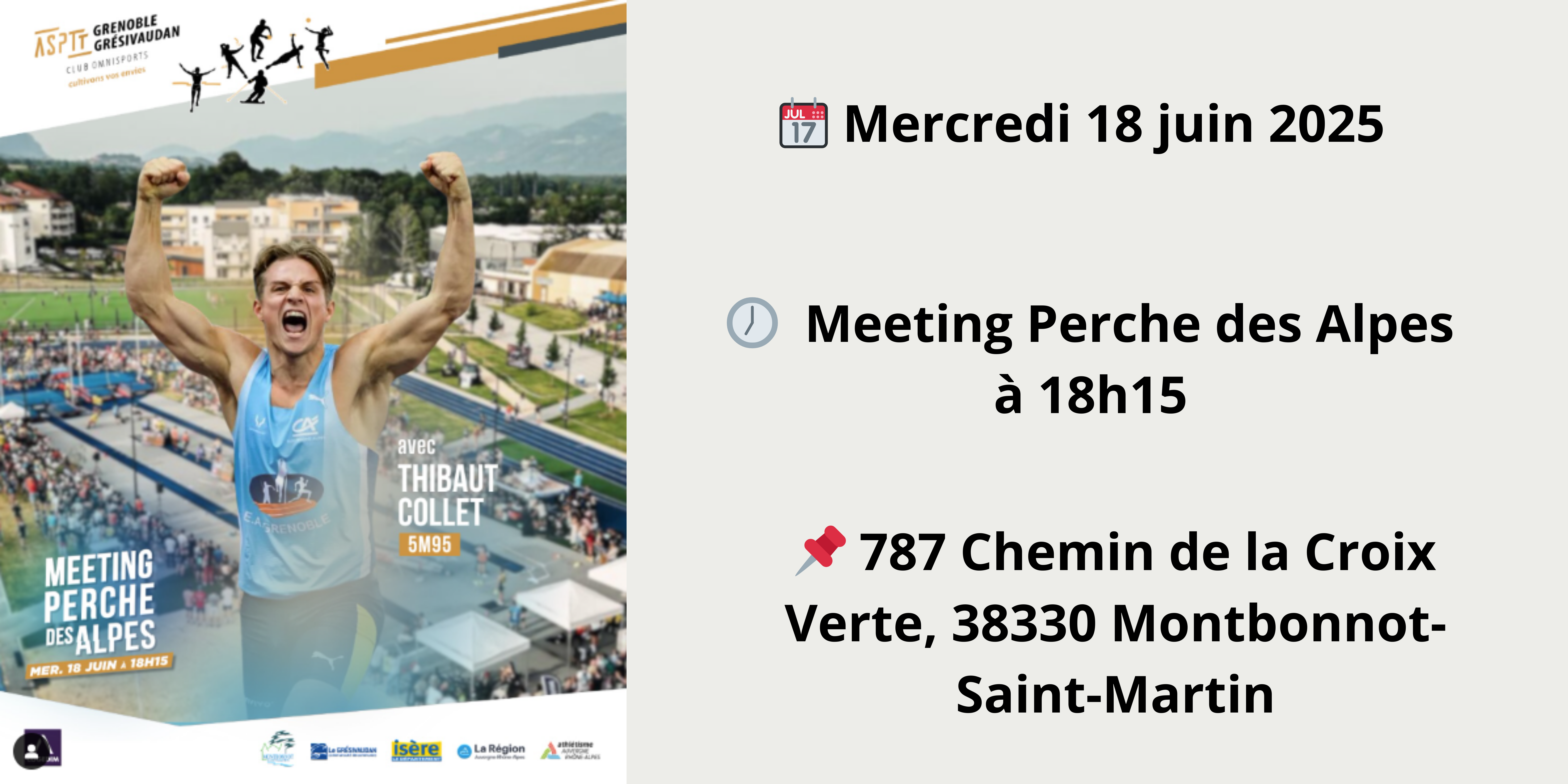 RDV le mercredi 18 juin à 18h15 au centre de l’ASPTT à Montbonnot-St-Martin pour le meeting Perche des Alpes avec des athlètes comme Thibaut Collet ou bien Léa Mauberret