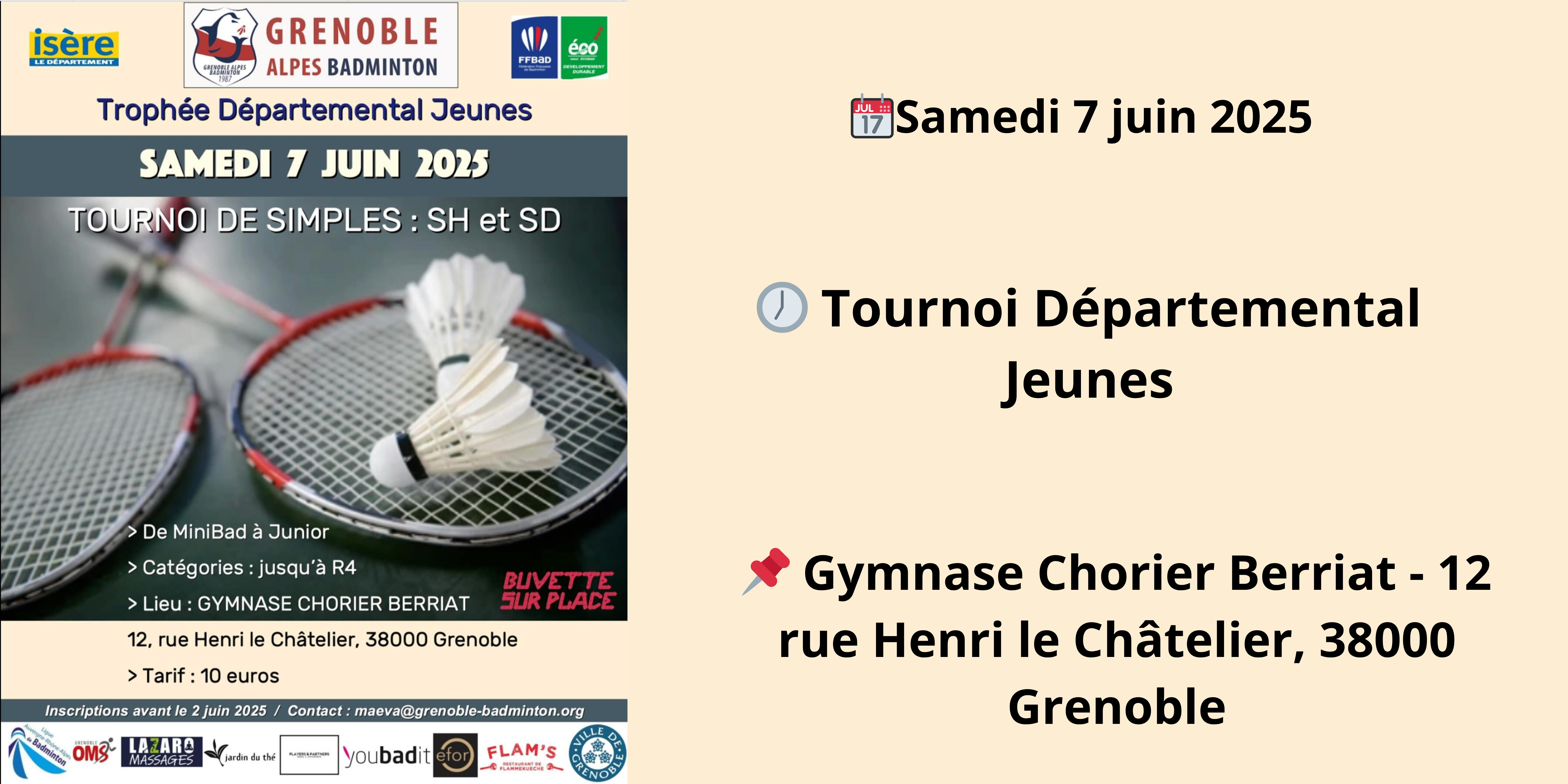 Grenoble Alpes Badminton est responsable de l’organisation du tournoi départemental jeunes qui aura lieu ce samedi 7 juin au gymnase Chorier Berriat – 12 rue Henri le Châtelier, 38000 Grenoble