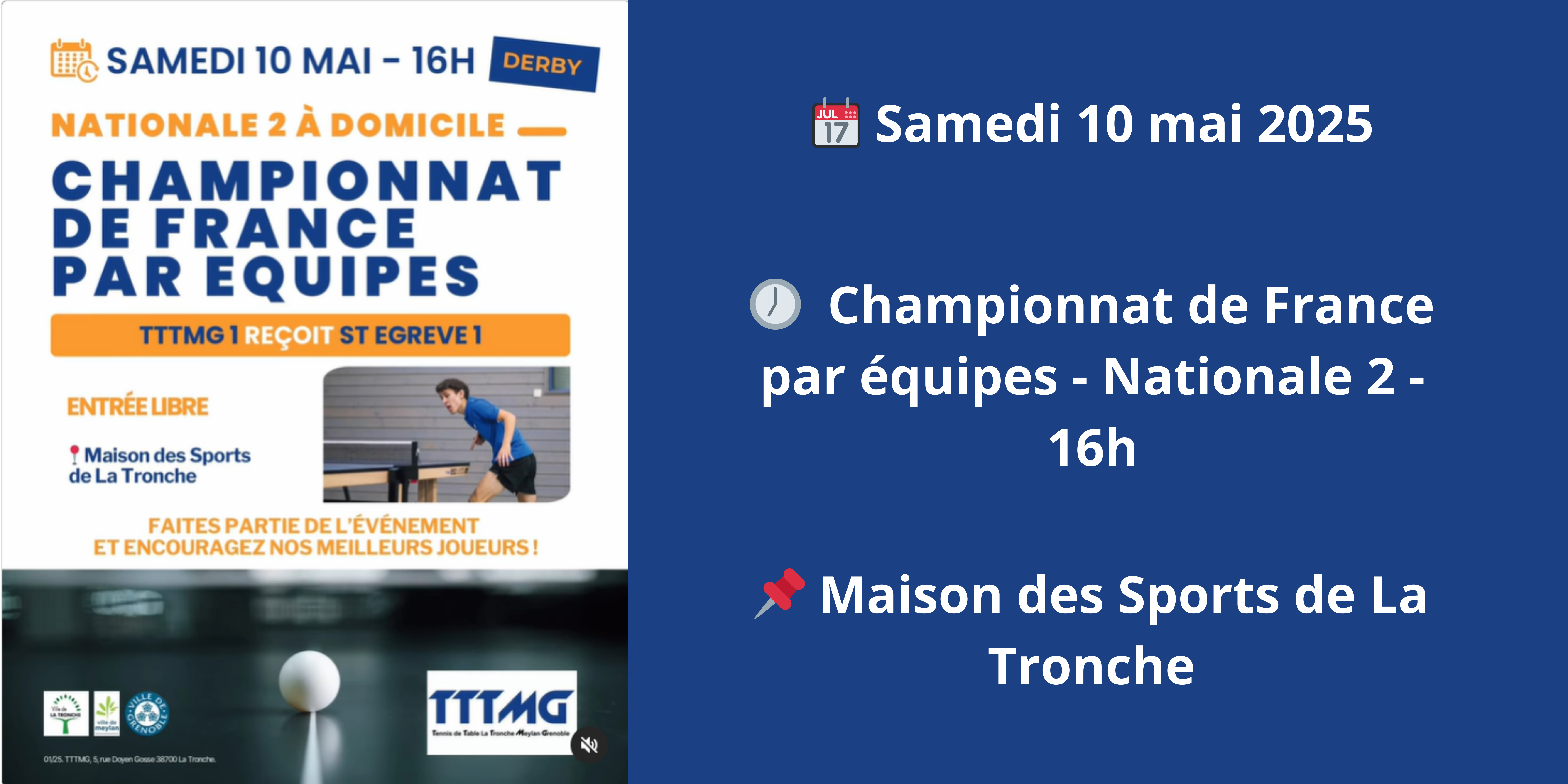 Ce samedi 13 décembre, les équipes N2 et N3 du grenoble alpes badminton seront à domicile, dans la grande Halle Clémenceau Programme : N3 vs Bron → 12h30 N2 vs Fos-sur-Mer → 16h00 Une animation Parents–Enfants aura lieu en amont, de 10h30 à 11h30, avec rencontre des joueurs de l’équipe N2 ! Halle Clémenceau – […]