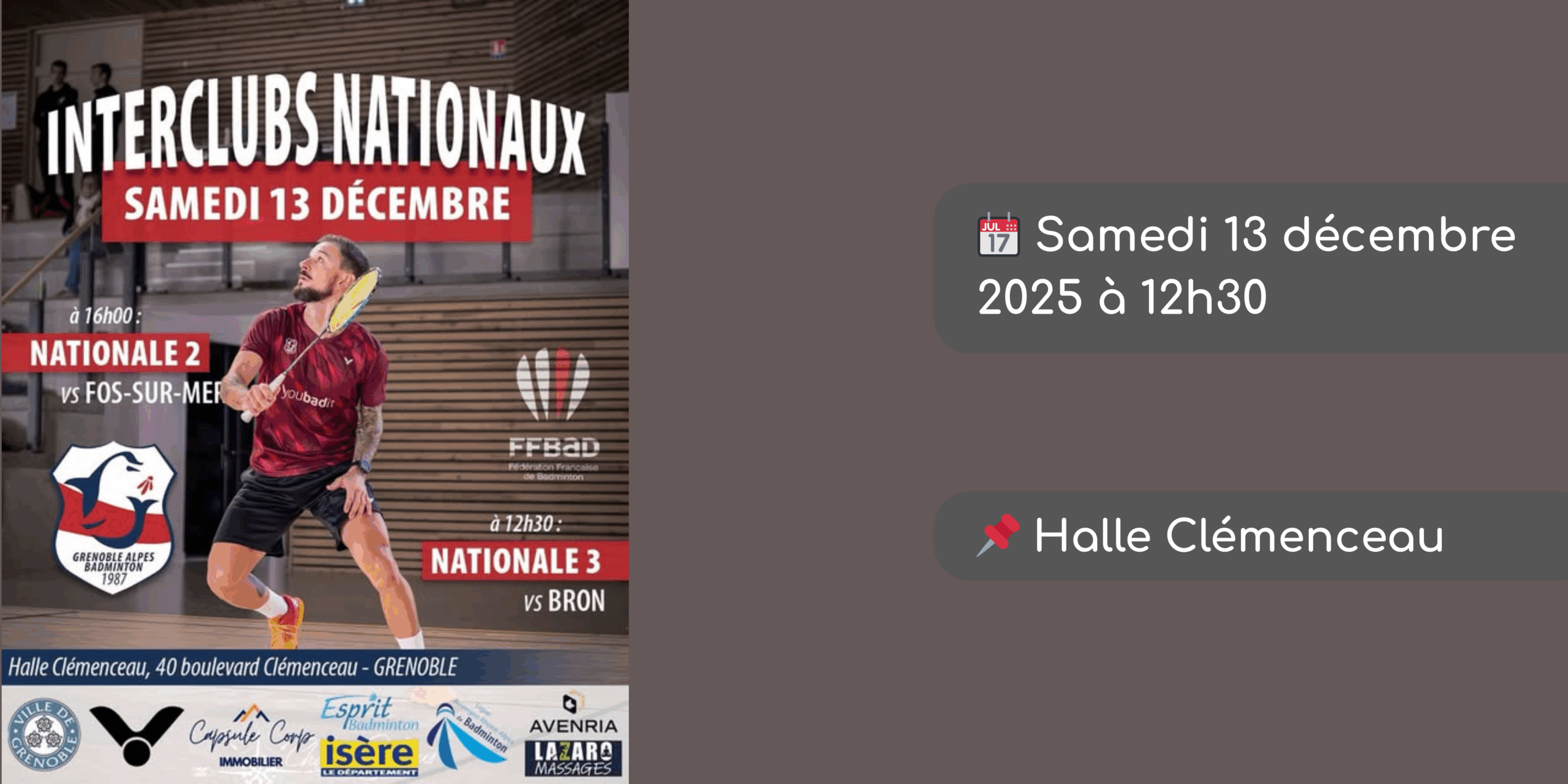 Halle ClemenceauCe samedi 13 décembre, les équipes N2 et N3 du grenoble alpes badminton seront à domicile, dans la grande Halle Clémenceau Programme : N3 vs Bron → 12h30 N2 vs […]