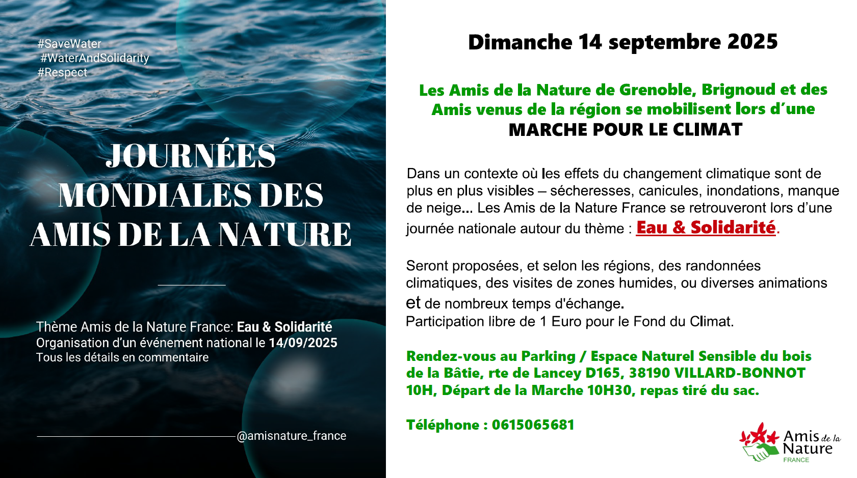 Les Amis de la Nature de Grenoble, Brignoud et des Amis venus de la région se mobilisent lors d'une marche pour le climat. Le thème de la journée nationale portera sur l'Eau & la Solidarité. Participation libre de 1€ pour le Fond du Climat. RDV au parking / Espace Naturel Sensible du bois de la […]