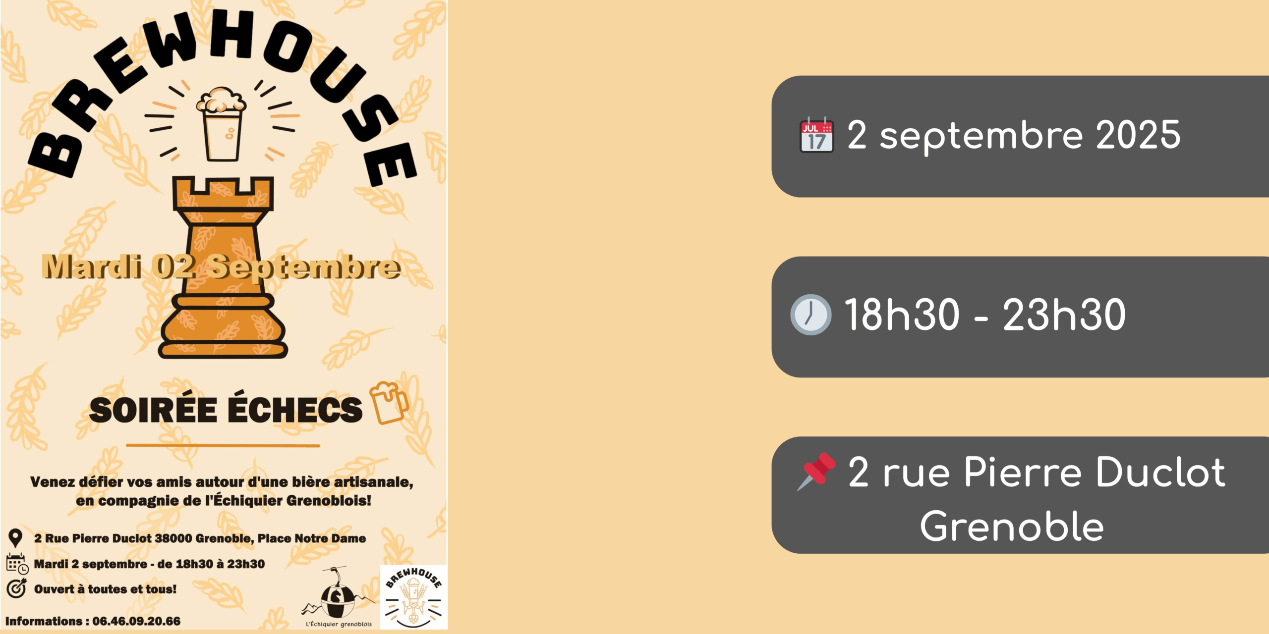 L'Échiquier Grenoblois au Deck Bar de Grenoble (Bar à Jeux) @live_escape_deck_bar_grenoble Jeudi 11 septembre 18h-01h : animations échecs avec initiation et jeu libre tous niveaux pour toutes et tous. Venez apprendre, découvrir et jouer aux échecs, passer un bon moment au Deck Bar tout en vous restaurant. Accès libre. Informations sur le site du Deck Bar section […] |