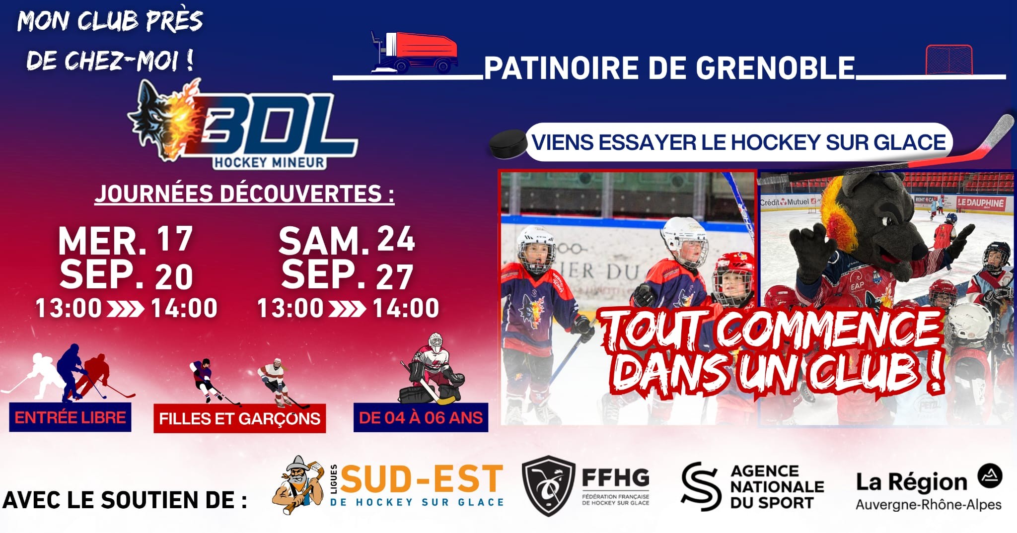 4 journées découvertes pour tester le hockey à la patinoire de Grenoble avec les Brûleurs de loups : Mercredi 17/09/25 et 24/09/25 Samedi 20/09/25 et 27/09/25 Horaires : 13h - 14h Entrée libre - Filles & Garçons - De 4 à 6 ans |
