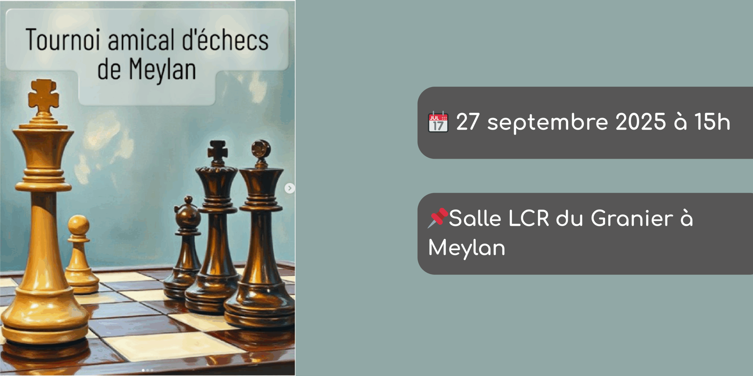 Tournoi amical Rapide (10 min, 7 rondes) avec L'Échiquier Grenoblois Samedi 27 Septembre à 15h précises - salle LCR du Granier à Meylan. Ouvert à tous les niveaux et tous les âges Pointage 15 min avant l'événement Limité aux 30 premiers inscrits Inscription par mail à fchomier@laposte.net (nom, prénom et adresse mail) |