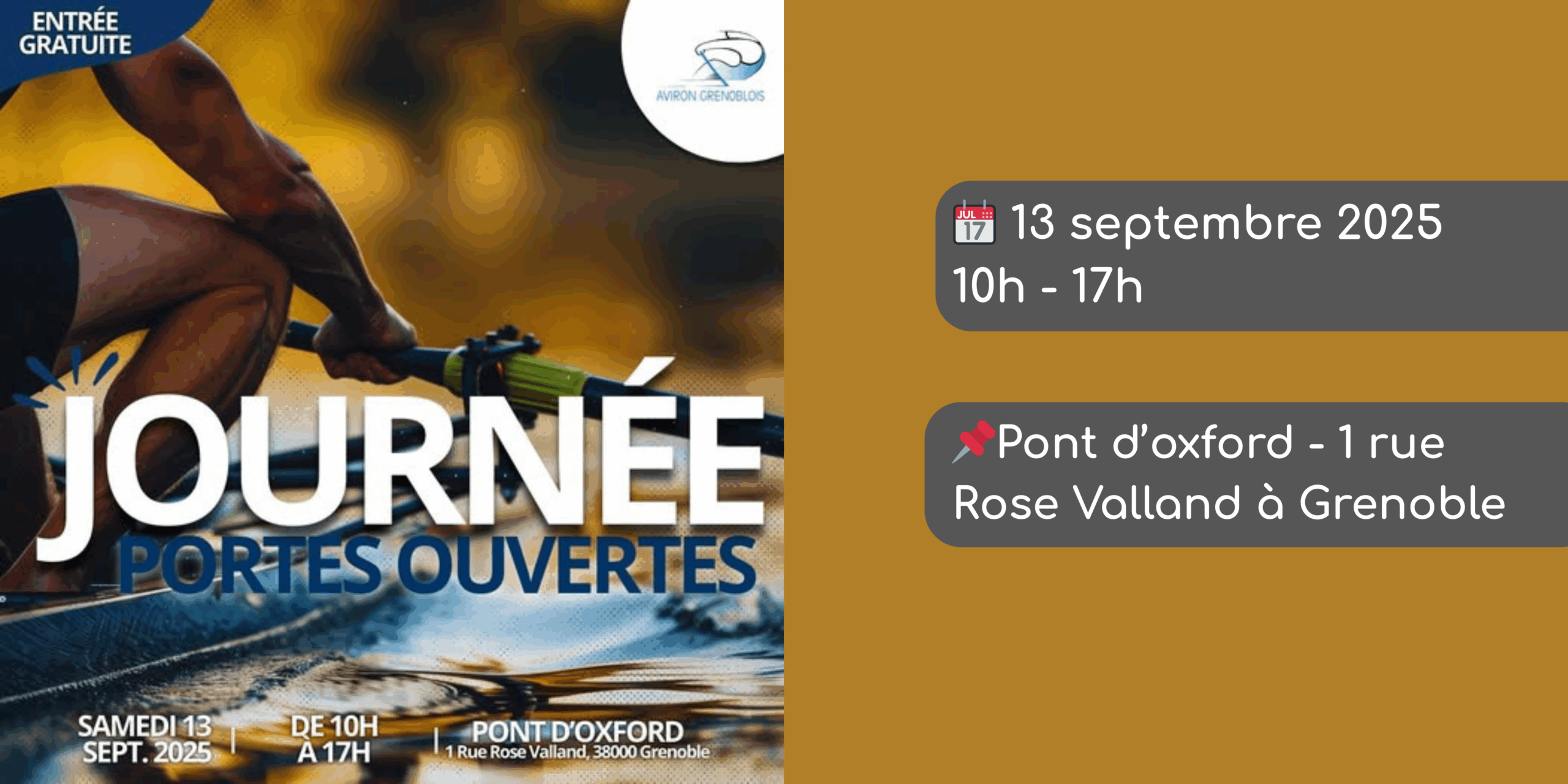 Portes Ouvertes – Aviron Grenoblois Envie de ramer autrement ? De tester un sport qui allie puissance, technique et sensations fortes sur l’Isère ? Le 13 septembre à partir de 10h, viens découvrir l’Aviron Grenoblois lors de notre journée Portes Ouvertes ! Au programme : Rencontre avec nos rameurs & coachs Visite du club et […]