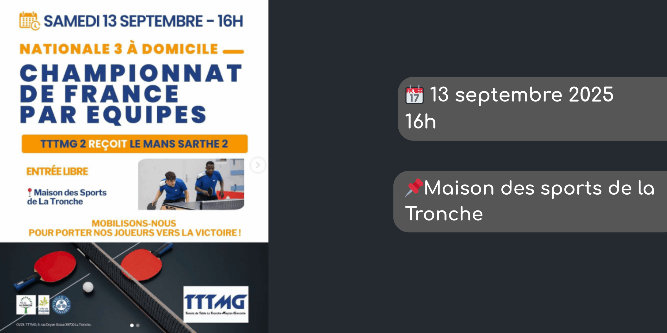 DOUBLE RENDEZ-VOUS À LA MAISON DES SPORTS ! 🔥 📅 Samedi 13 septembre – 16h Venez encourager nos équipes lors du Championnat de France par équipes 🏓 💥 Nationale 2 : TTTMG 1 vs Pays Rochois Genevois 1 💥 Nationale 3 : TTTMG 2 vs Le Mans Sarthe 2 🎟️ Entrée libre 📍 Maison des Sports de La […] |