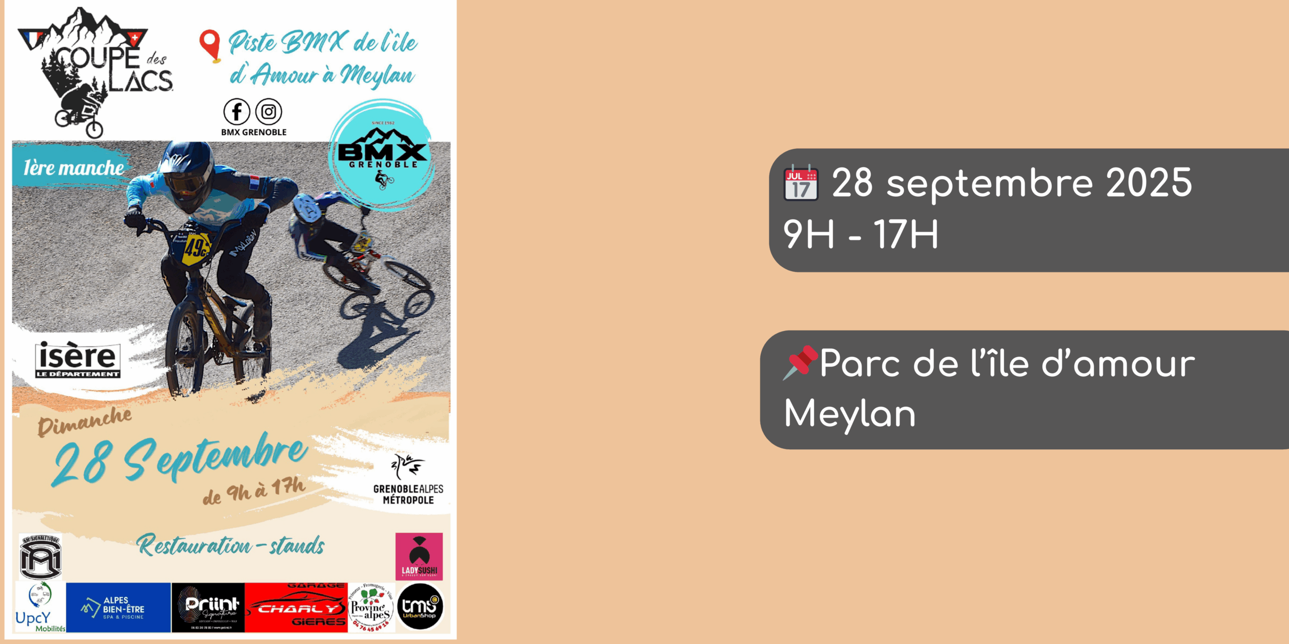 Le club de BMX Grenoble et ses partenaires sont heureux de vous accueillir pour la 1ère manche de la Coupe des Lacs dimanche 28 septembre 2025 Samedi 27/09 : piste ouverte pour des essais libres entre 15h et 17h sous la responsabilité des parents Dimanche 28/09 : 9h-9h45 : Essais grille Bloc 1 (piou-piou, […] |