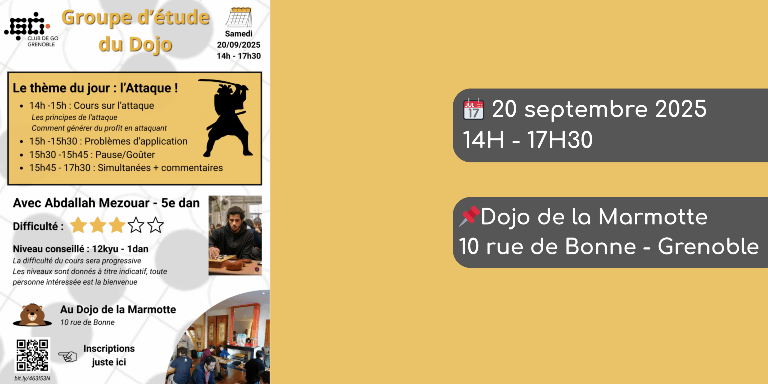 Groupe d'étude au Dojo de la Marmotte organisé par le Club de Go de Grenoble avec Abdallah Mezouar - 5e dan Thématique : L'Attaque ! 14h-15h : Cours sur l'attaque, les principes et comment générer du profit en attaquand 15h-15h30 : Problèmes d'application 15h30-15h45 : Pause / Goûter 15h45-17h30 : simultanées + commentaires Inscriptions […]