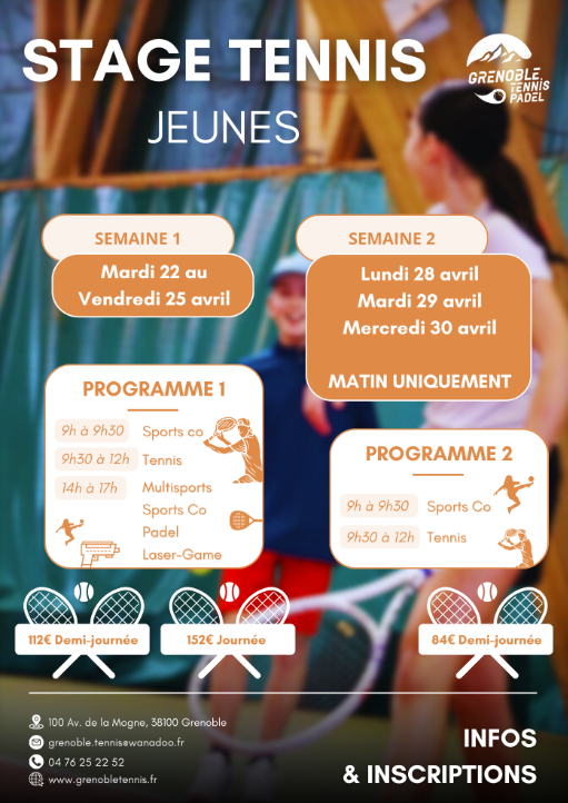 Stage de tennis avec des cours techniques et tactiques le matin de 9h à 12h. L’après-midi, différentes activités telles que du padel, sports collectifs, laser game.