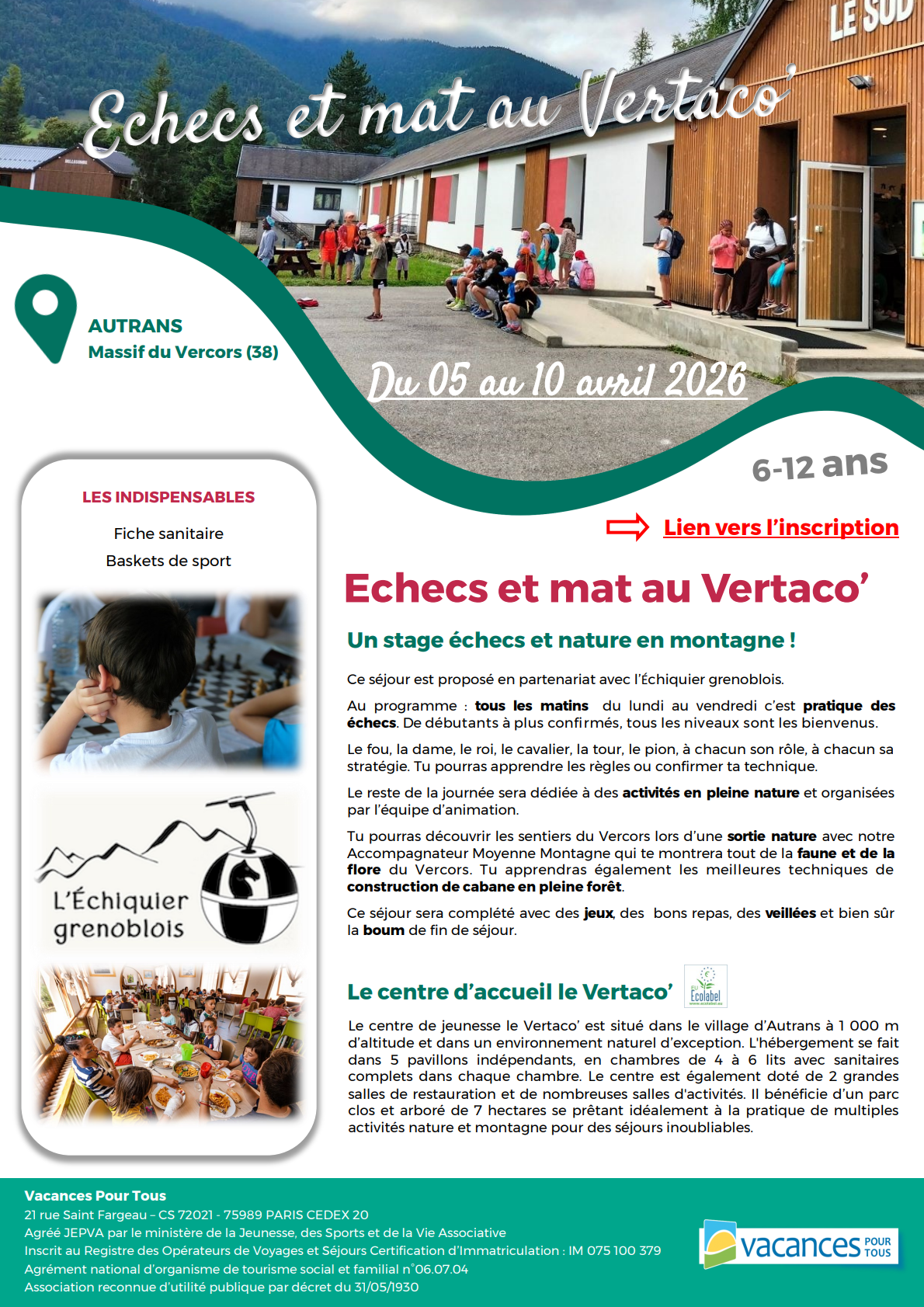 Apprendre les règles et confirmer sa technique d’échec les matins et animation en pleine nature l’après-midi.