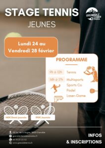 Stage de tennis avec des cours techniques et tactiques le matin de 9h à 12h. L’après-midi, différentes activités telles que du padel, sports collectifs, laser game. Pour le midi, apportez votre repas ou déjeunez au restaurant du club (8€ par jour)